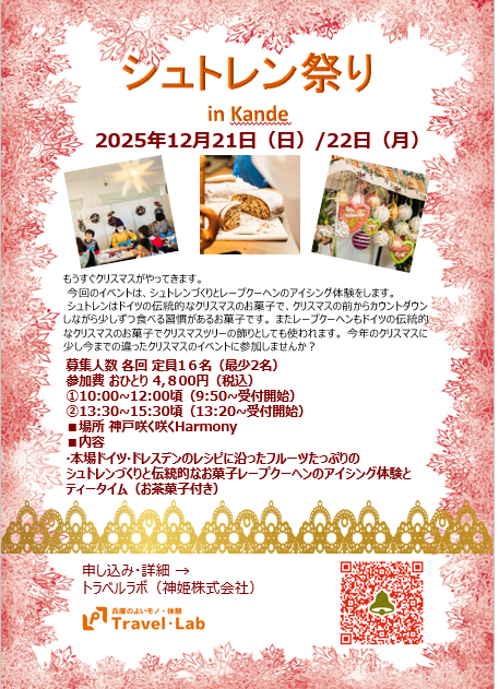 シュトレンはドイツの伝統的なクリスマスのお菓子で、クリスマスの前からカウントダウンしながら少しずつ食べる習慣があるお菓子です。 またレープクーヘンもドイツの伝統的なクリスマスのお菓子でクリスマスツリーの飾りとしても使われます。 今年のクリスマスに少し今までの違ったクリスマスのイベントに参加しませんか?